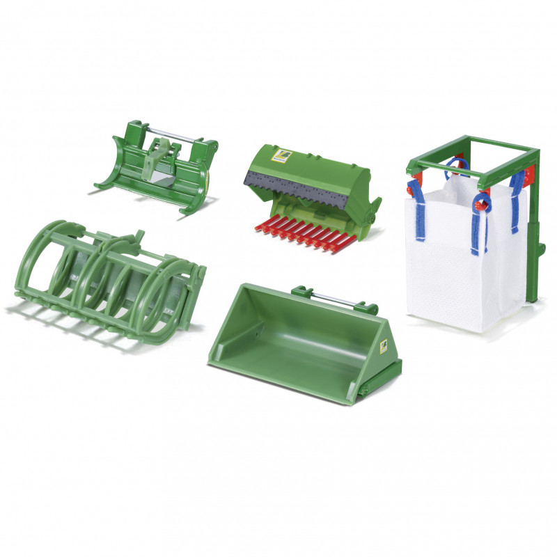 Tillbehörssats för frontlastare för alla 1:32 traktorer från SIKU Farmer med frontlastare. Satsen innehåller främre skyffel, gaffelställare, ensilageskärare och även XL gaffel och big pack fäste inklusive matchande big pack.