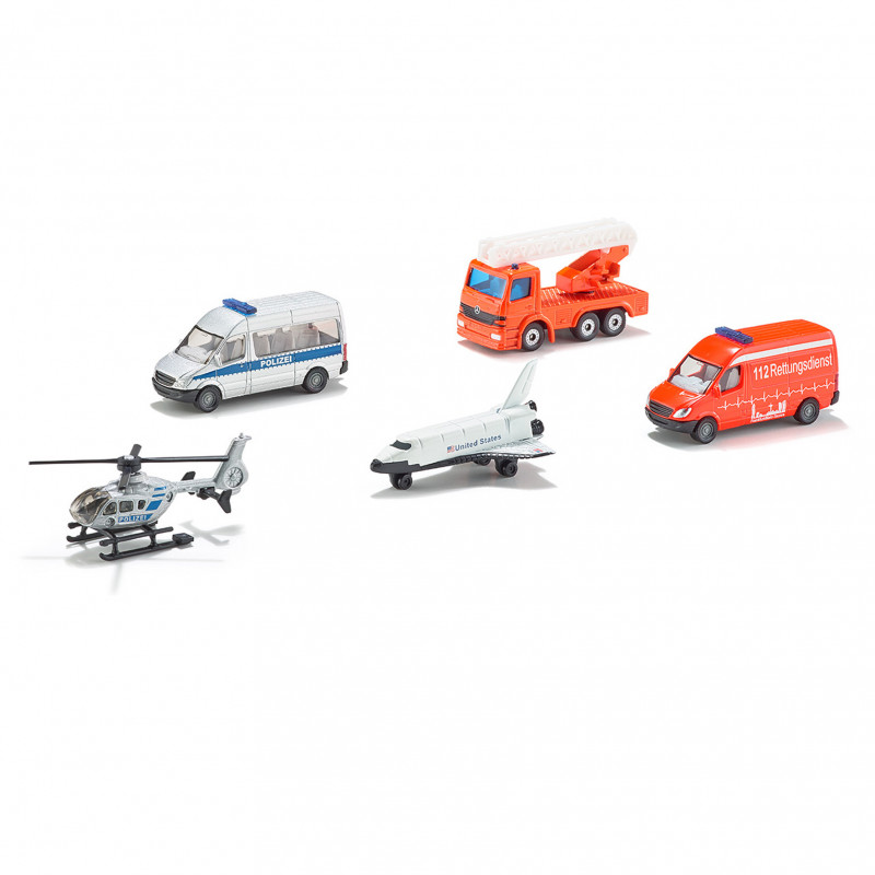 Komplettera din SIKU-samling med fem nya modeller som är ett måste i varje samling. I detta paket med följer en polisbil, en räddningstjänstbil, ett flygplan, räddningshelikopter, och en lastbil med stege.
