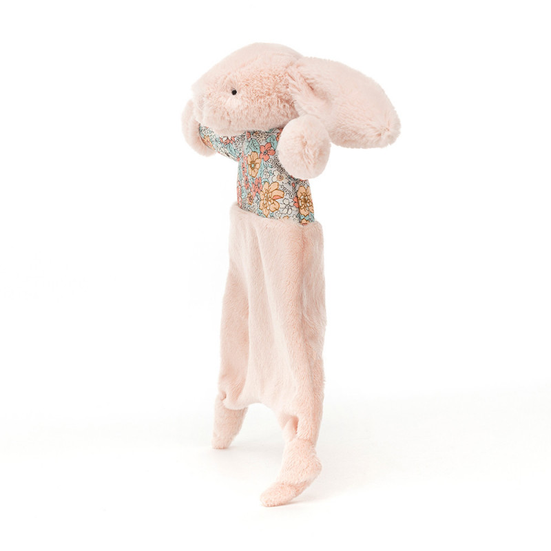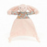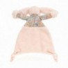 En snygg och kul snuttefilt i form av en gosig ljusrosa kanin i en vacker småblommig tröja med ett retro mönster i bleka nyanser av persiko-rött, senapsgult och blågrönt. Snutten har ett sött och mjukt leende kaninhuvud med långa, gosiga hängande öron, en söt rosa nos, öppna armar redo för en kram, en gosig mage och knutar i de nedre hörnen som fötter. Den perfekta kompisen för tuppluren efter en kul picknick, eller när som helst när det kan behövas lite tröst, stöd eller trygghet. Tvättas i 40 graderC skontvätt och hängtorkas. . . Storlek: ca 25 x 22 cm.
