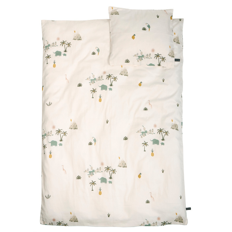 Sängkläder tillverkade av ekologisk bomull med tropiskt motiv. Satinväv med tryckt motiv. Knäpps med knappar. Skötsel: °30 - 60 C, fintvätt, hängtorkas.