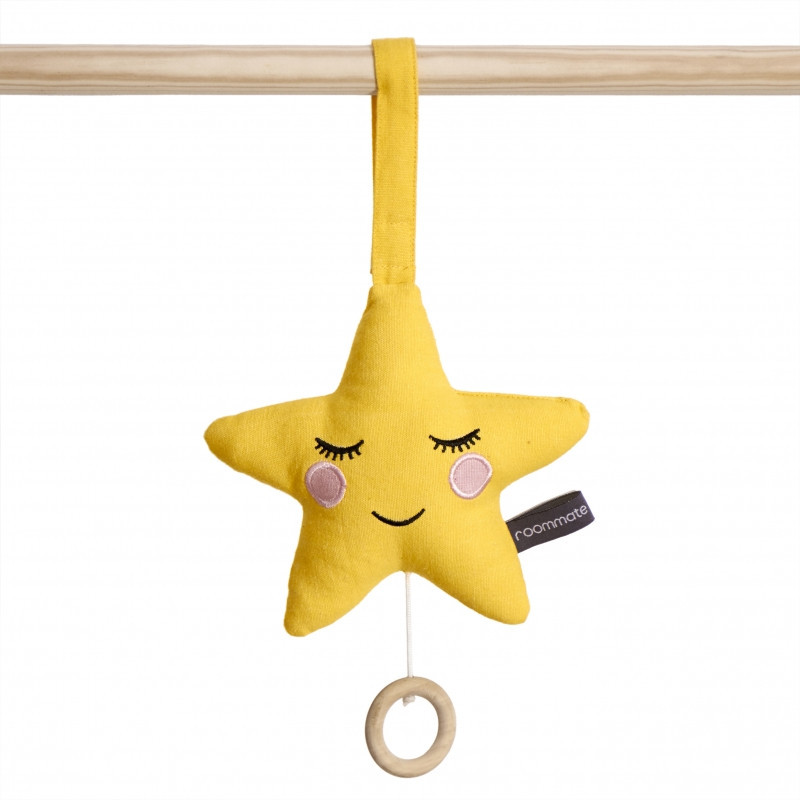 Fin speldosa i form av en ljuvlig stjärna. Tillverkad i organisk bomull i gyllengult, speldosans draghandtag är tillverkat i trä. Oeko-Tex standard 100. Med broderade detaljer. Musik som spelas: en långsam version av Brahms vaggvisa. Rengörs med fuktig trasa. Från +0 år Storlek: 17 x 16 cm