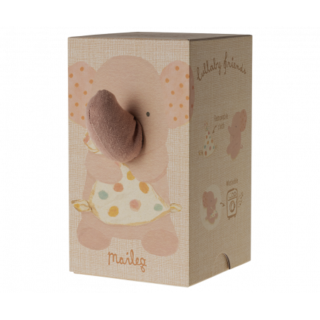 Lullaby friends är en kollektion av vackra produkter för bebisar. Denna elefant har en mjuk gosfilt och spelar Mozarts vaggvisa när du drar i svansen. Den är tillverkad i mjuka tyger med unika tryck och förpackad i en vacker presentask.