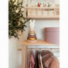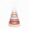En klassisk stapelleksak i dova färger.  Låt ditt barns kreativitet flöda och stapla de olika klossarna i olika ordningar.  Stapelleksaken har en pinne som man trär de olika ringarna över.  Pinnen hålls av säkerhetsskäl på plats av ett gummiband i bottenplattan.  Med stapelleksaken kan barnet lära sig räkna, urskilja olika färger och storlekar samt öva på motoriken.  Längst upp på toppen sitter en söt kanin i trä.