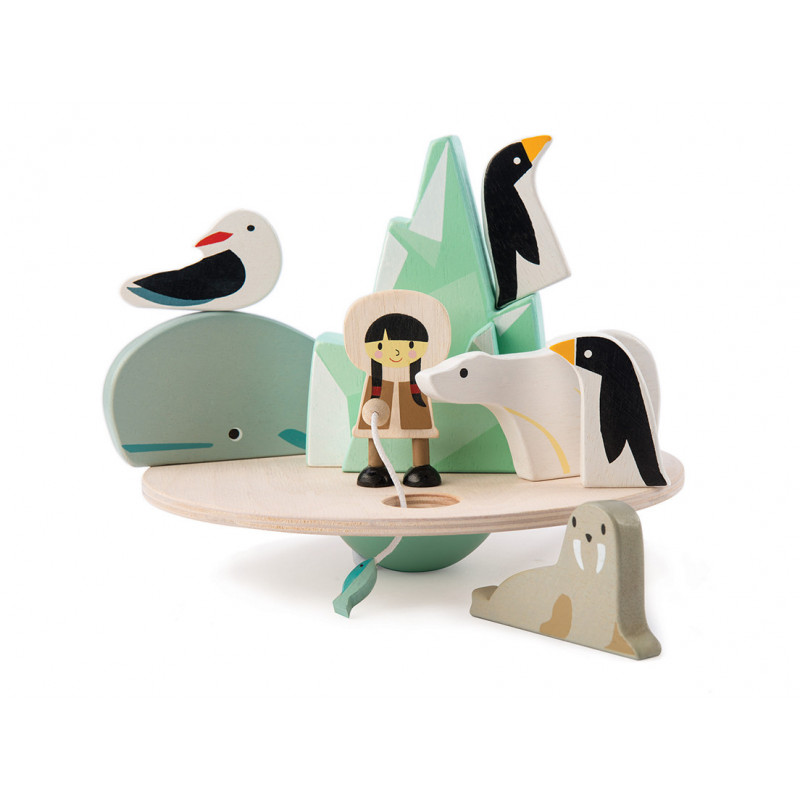 Försök att balansera de roliga figurerna på plattan utan att de trillar av. Den här fina balansleken är härligt formgiven i moderna färger och former. En val, en mås, två pingviner, en valross, en isbjörn, ett isberg och en liten fiskande enuit-flicka ska samsas på utrymmet och stå stadigt på land. Också roligt att leka med bara figurerna. +3 år pga små delar Design: Tender Leaf Toys