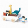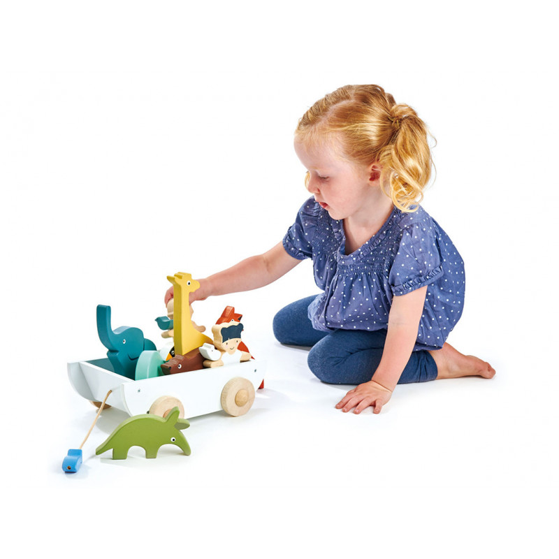 En jättefin liten dragvagn i trä, fylld med roliga trädjur och ett par kompisar: pingvin, björn, räv, myrslok, giraff, val, elefant, en pojke och en flicka. Roliga att balansera på varandra och leka med. Vagn: 27,5x19x9,5 cm +3 år pga små delar Design: Tender Leaf Toys