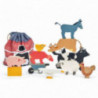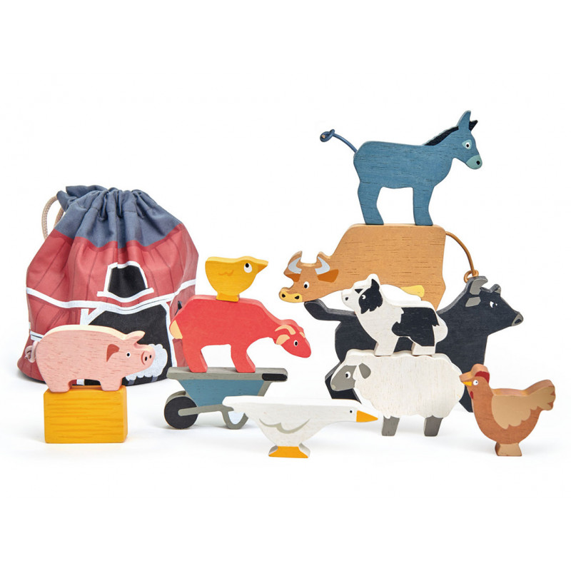 Här får du träna din balansförmåga, minsann! Tygpåsen innehåller massor av bondgårdsdjur, en höbal och en skottkärra. Stapla så högt du kan och hitta precis rätt balans. Roligt att leka med själv, men också spännande att ta en tur i taget och se vem som balanserar högst, innan allt rasar. 12 delar. Tillverkat i trä. +3 år pga små delar Design: Tender Leaf Toys
