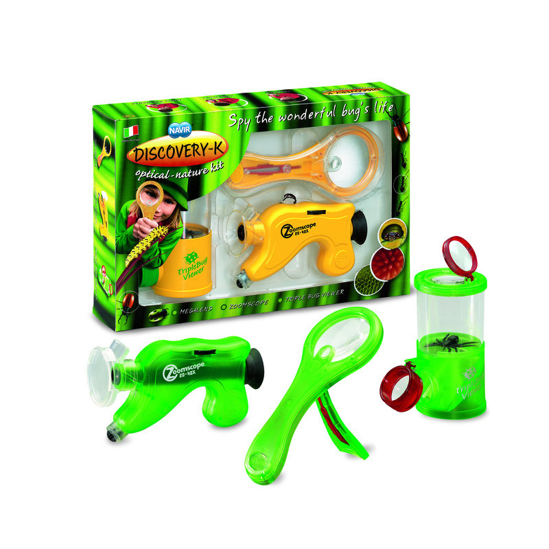Ett kit med tre olika instrument för att upptäcka och undersöka vår spännande natur. I denna förpackning hittar du en insektsburk med möjlighet att studera objektet uppifrån, horisontellt och underifrån. Förstoringsglas med pincett och ett Zoom scoop som också ger dig möjlighet att studera objekten på nära håll. Kommer som tvåpack, ett gult kit och ett grönt. Från 6 år