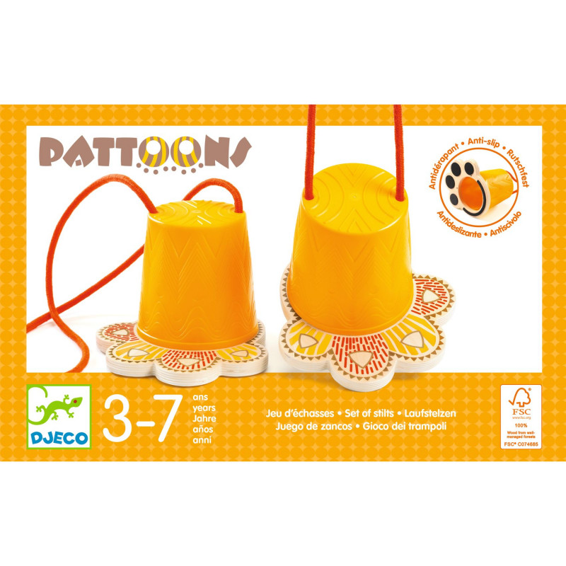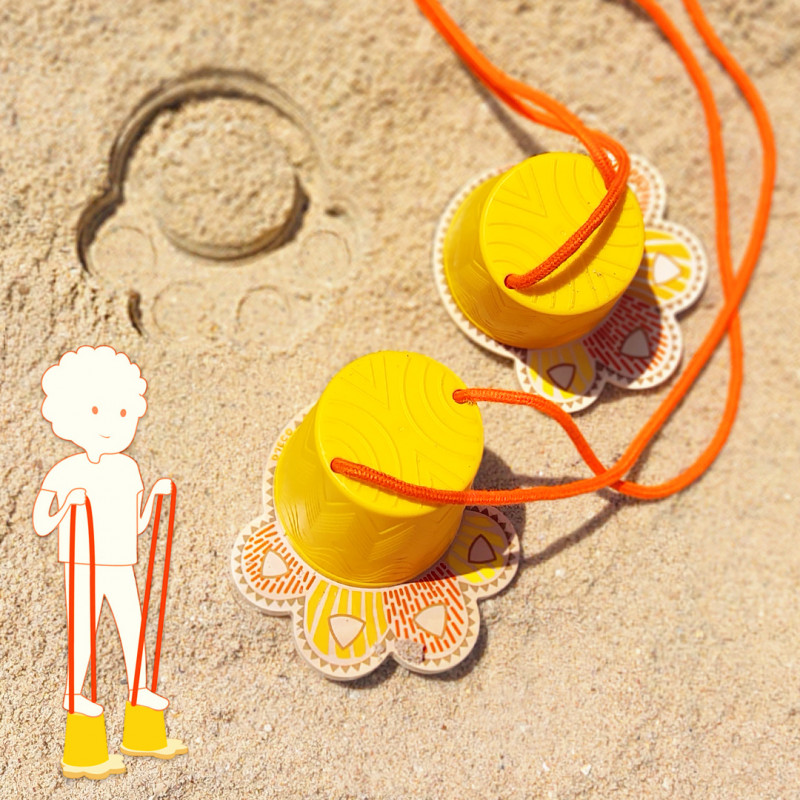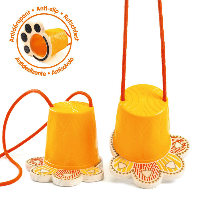 Max belastning 50 kg. Burkstyltor att försöka balansera omkring på, designade med snygga tassar av trä som ger roliga fotspår i till exempel sand. Själva burkarna är gjorda av plast, med "fotsulor" av hållbart trä som har målad design på ovansidan och halkskydd undertill. Längden på bomulls snörena som barnet ska hålla i kan justeras med hjälp av knutar inuti burkarna för att passa barnets längd. Barnet klättrar upp på de två styltorna, håller snörena spända och försöker hålla balansen när hen går framåt: om en fot nuddar marken har hen förlorat! Om det finns mer än en spelare kan de ha ett lopp: ta tid på hur lång tid det tar att slutföra en bestämd bana, och den som får kortaste tiden vinner! Tillverkade med FSC®️ certifierat trä.