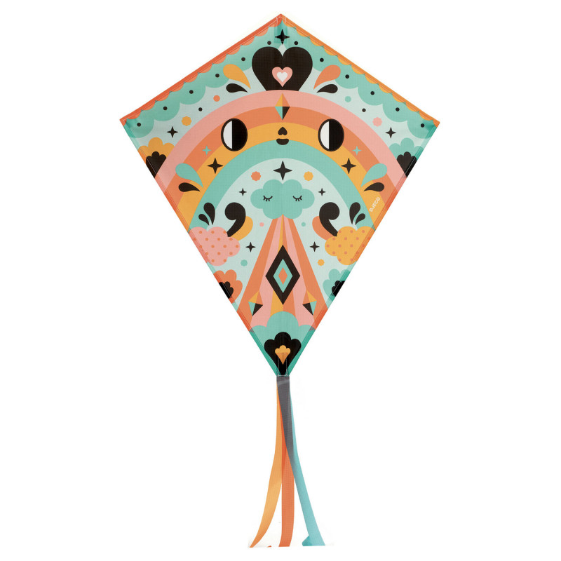 Denna söta och färgglada drake med klassisk form är illustrerad med en regnbåge och moln i den söta Kawaii-stilen och har en 2,5 meter lång svans av tre band som hjälper draken att fånga vinden. Draken har en pop-up funktion som gör monteringen enkel: det är bara en del att montera och en lina (40 meter lång) med handtag att knyta fast. Drakens stödpinnar är tillverkade av fiberglas och själva draken är av polyester, så drakens låga vikt gör den enkel att hantera och ganska enkel att få upp i luften. För enkel och ganska kompakt förvaring kommer draken med en förvaringsficka i genomskinlig PVC med en tryckknapp. Om man inte räknar med svansen är draken 70 cm lång och 60 cm bred. Från +5 år.