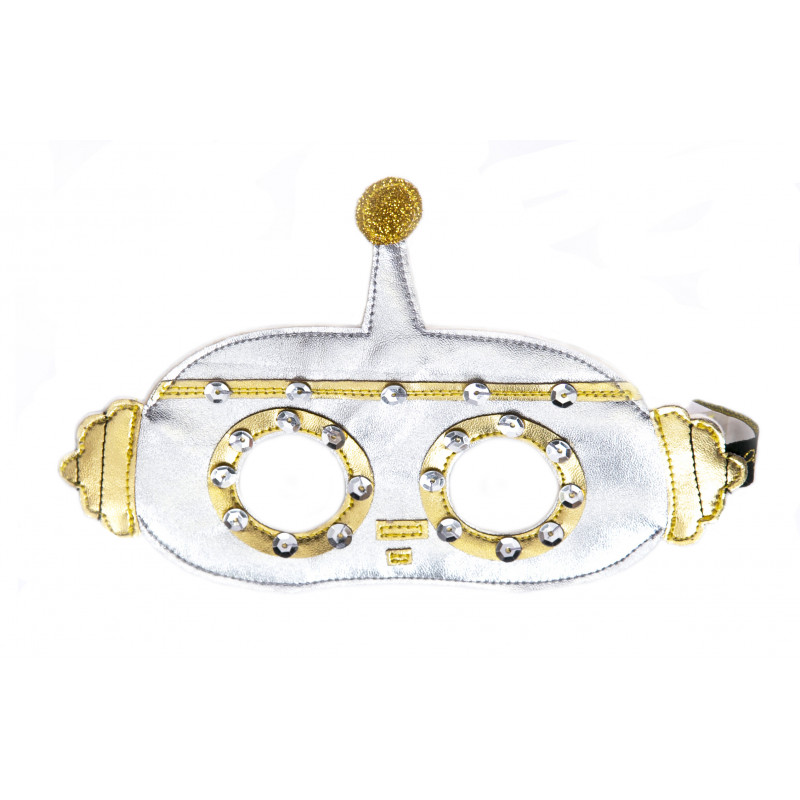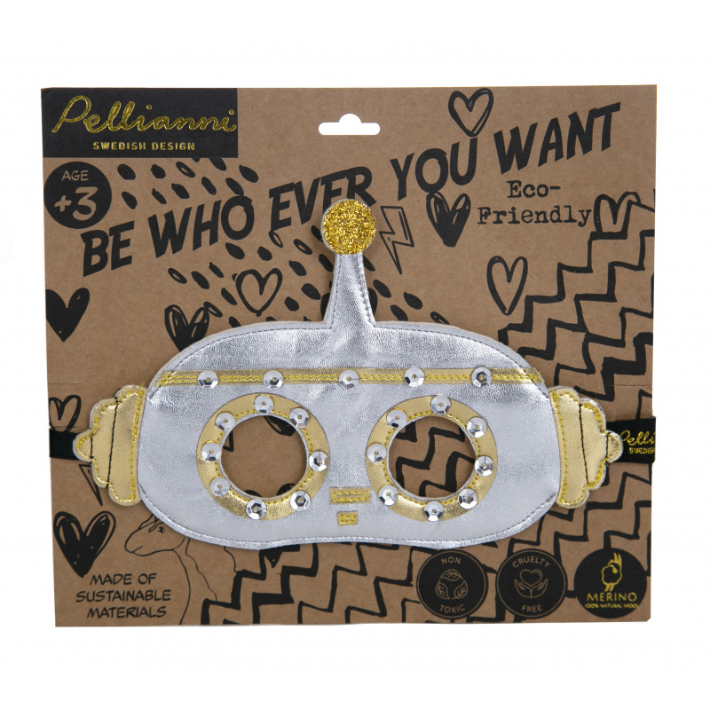 När du ska klä ut dig till en robot är denna masken ett bra val - tillverkad av Australiensisk merinoull (framtagen utan att utsätta fåren för grymheter); veganskt läder och dekorerad med miljövänligt glitter. Masken kliar inte och har ett 1 cm brett band med gummiband halva vägen samt långa ändar som du kan knyta för att justera passformen. . Koldioxid-utsläppen från produktion och transporter är kompenserade för att minimera dess miljömässiga fotavtryck. Materialen i masken är testade för att