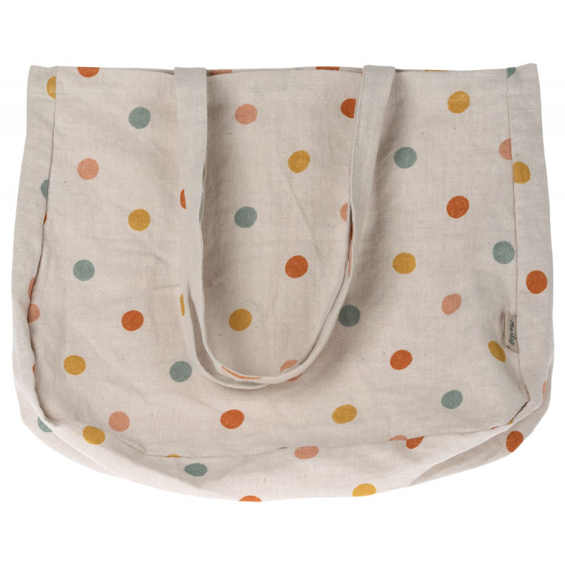 En söt tygväska tillverkad i linnetyg, beige botten med färgglada prickar. Varumärke Maileg