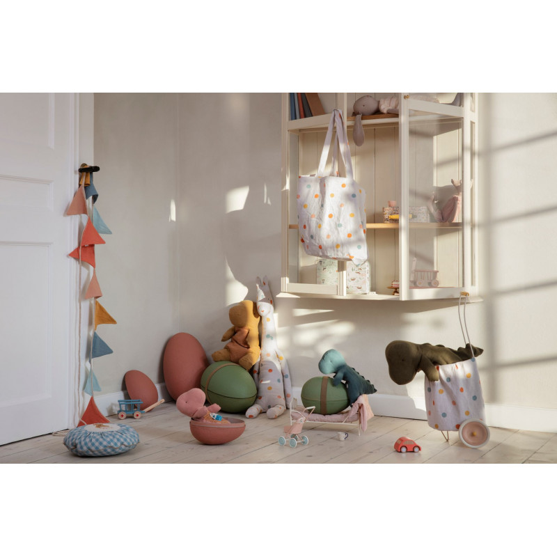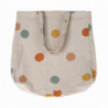 En lite större tygväska tillverkad i linnetyg, beige botten med färgglada prickar. Varumärke Maileg