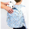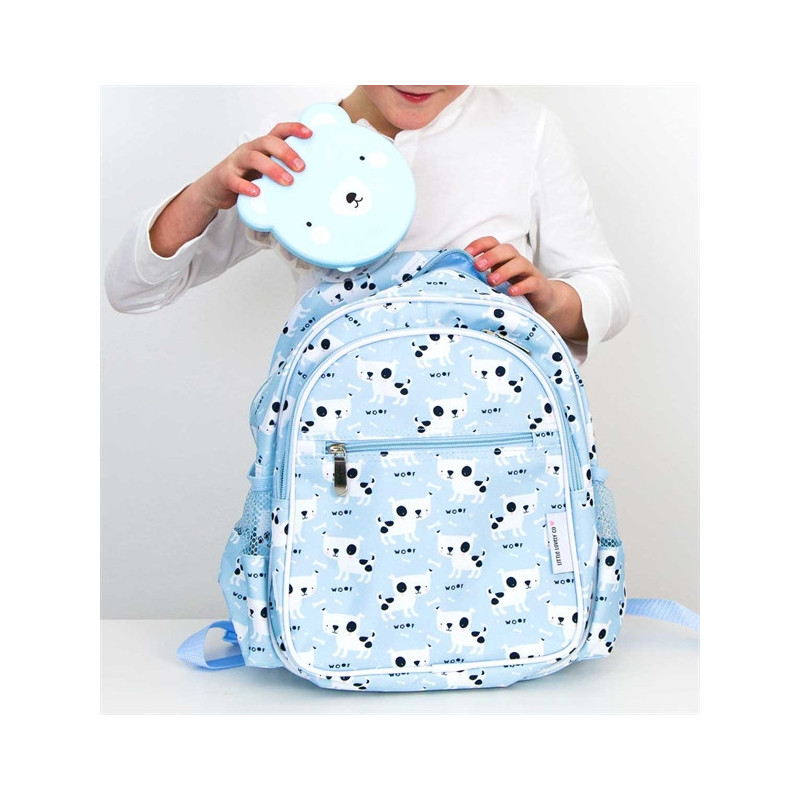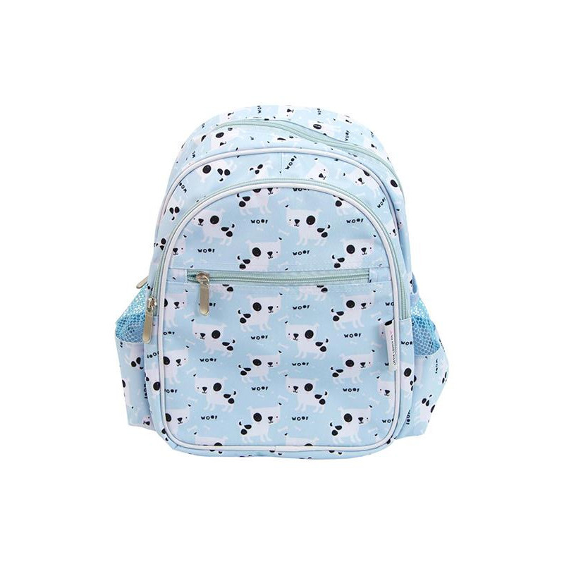 En underbar ryggsäck, blå med vita små hundar på. Ryggsäcken har ett stort fack och två lite mindre frampå som stänges med dragkedjor. På sidorna finns två öppna fack. Remmarna över axlarna går att reglera, man kan även knäppa ihop dessa så dem inte hasar ner. Storlek: 30 x 33 x 14.5 cm
