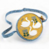 En snygg rund handväska dekorerad med en elegant bild på svanar. Utrustad med en mönstrad axelrem med justerbar längd samt en dragare (kläpp/flärp) till dragkedjan formad som konturen av en trollslända. Utsida av 100% bomull och foder av 90% polyester, 10% bomull. Storlek på själva väskan: ca 17 cm i diameter, 4,3 cm djup.