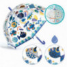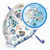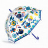Ett roligt paraply för barn dekorerat med fiskar och olika vattenlevande djur och växter på genomskinlig plast. Handtaget och spetsen på paraplyt är mörkblått. Med glasfiberram och ett säkerhetssystem för att undvika klämskador när paraplyet fälls upp och ihop. Tack vare att paraplyt är genomskinligt kan man se barnet och vad det gör (och barnet kan även se ansiktet på vuxna, skyltar och annat som annars skulle skymmas av paraplyet). Detta paraply har också den extra funktionen att större delen av fiskarna är ljusgrå tills paraplyet blir blött - men då blir det en färgexplosion i övervägande blåa nyanser. Detta kan hjälpa till att få ut eller få iväg barnen även när det regnar och är tråkigt. Från 3 år.