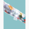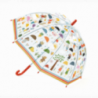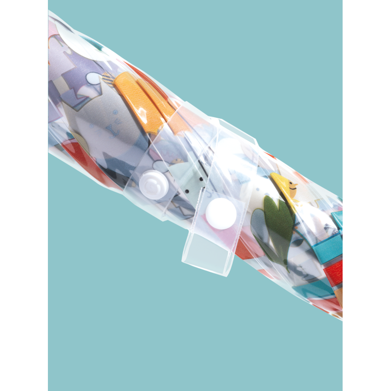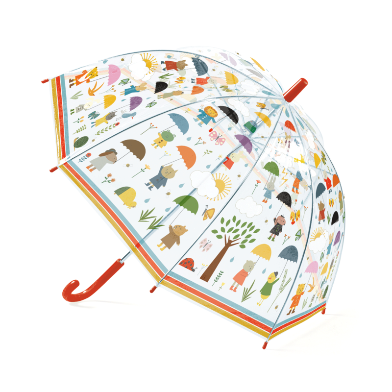 Ett kul barnparaply i transparent plast med ogenomskinliga och färgglada bilder av djur i regnrockar med paraplyer. Med ram i fiberglas och ett säkerhetssystem som ska förhindra klämda fingrar vid öppning och stängning. Handtaget är rött och av en böjd modell som gör att paraplyet kan hängas upp i handtaget när det inte används. Från 3 år. Storlek utfällt: Ø 70 x 68 cm.