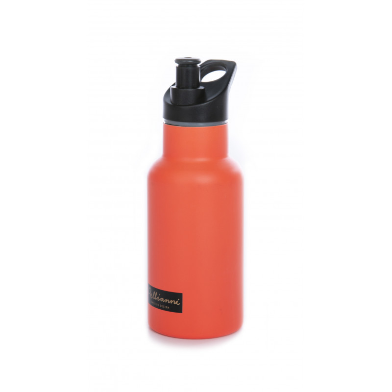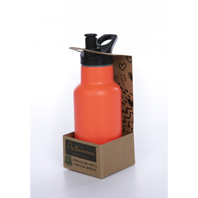 En riktigt snygg och praktisk termos eller vattenflaska i dubbel-isolerat, miljövänligt, rostfritt stål 18/8. Denna flaska har en lysande orange färg med matt finish, är stöttålig samt har sport-kork och en kraftig ögla där du kan fästa till exempel en rem eller en karbinhake. Storlek: 350 ml.